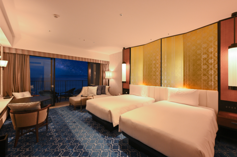 メインエリアのイルミネーションビューを楽しめる限定宿泊プランも販売されています。全室バルコニー付きの広々とした客室からは、昼間は目の前に広がる碧い海、そして日没後は夜空を彩る光のアートを眺めることができます。客室から特等席で光の祭典を楽しめる贅沢な体験は、冬の沖縄旅行をより特別なものにしてくれることでしょう。