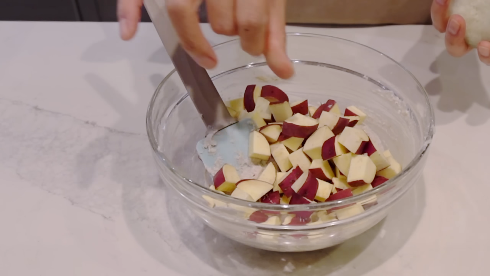 3.ボウルにさつまいもと塩を加え、しっかりと全体を混ぜ合わせます。