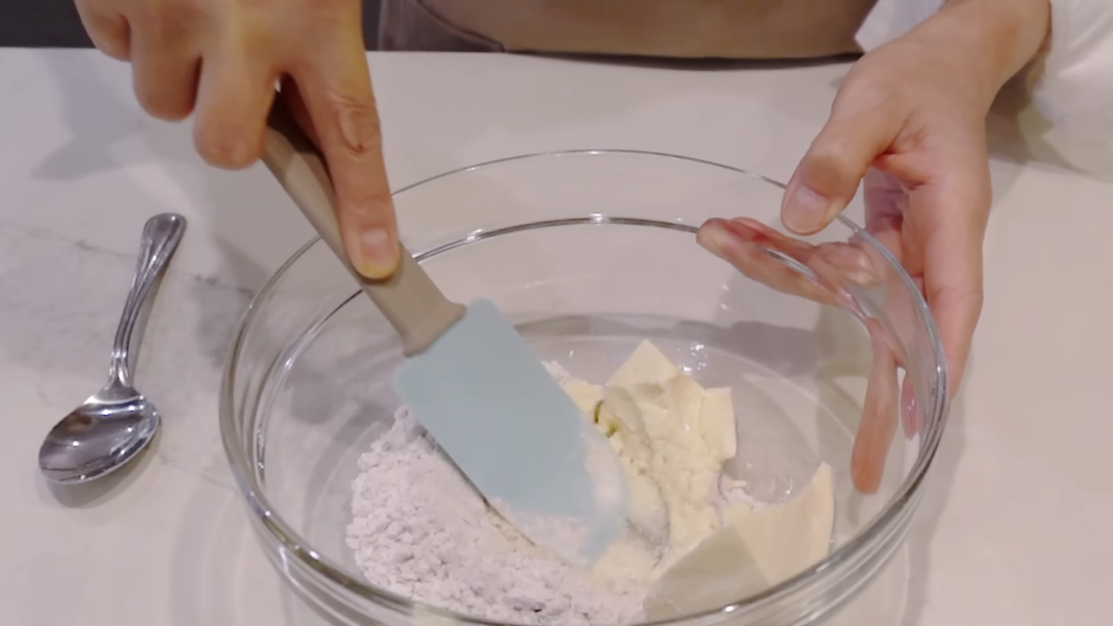 2.ボウルの中に米粉と豆腐を入れ、混ぜ合わせます。生地がヘラからポテッと落ちるくらいのかたさを目安にしてください。