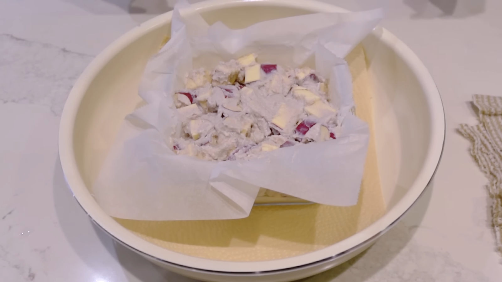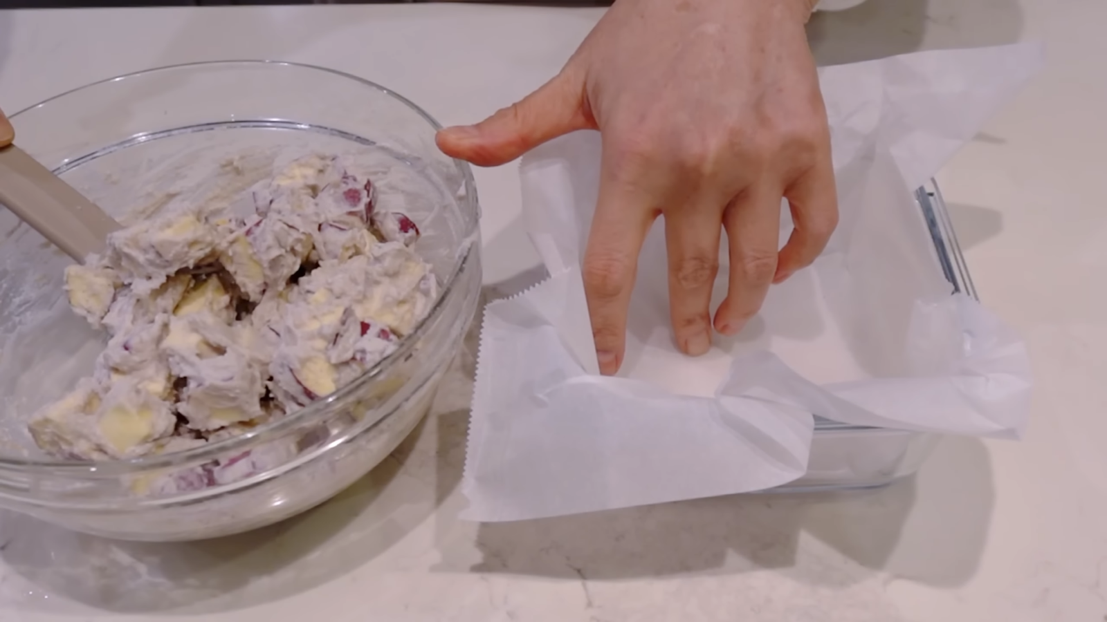 4.耐熱容器にクッキングシートを敷き詰めて、生地を移します。