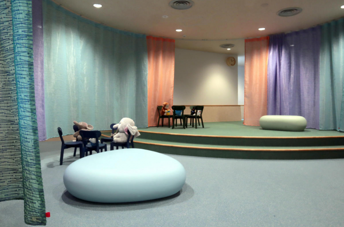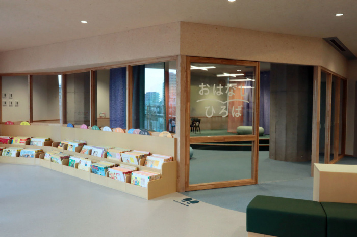 特に目をひいたのはこちらの「おはなしひろば」。こちらは読み聞かせやイベントなどが行われる場所となっており、カラフルなカーテンは“いかなご柄”でめちゃくちゃかわいかったです♡