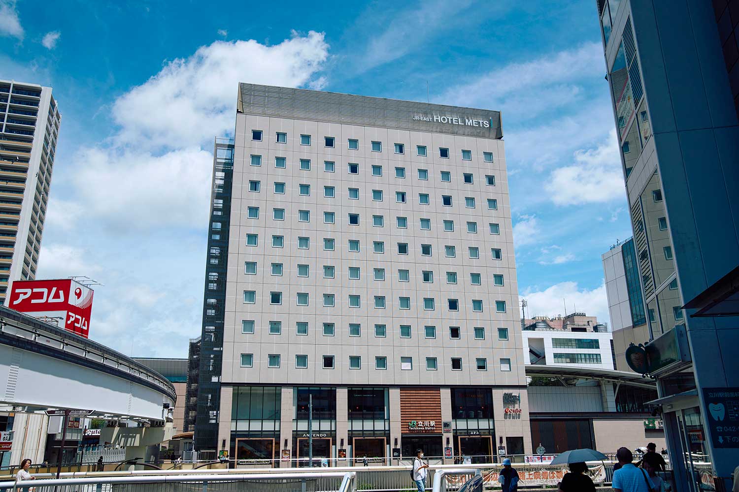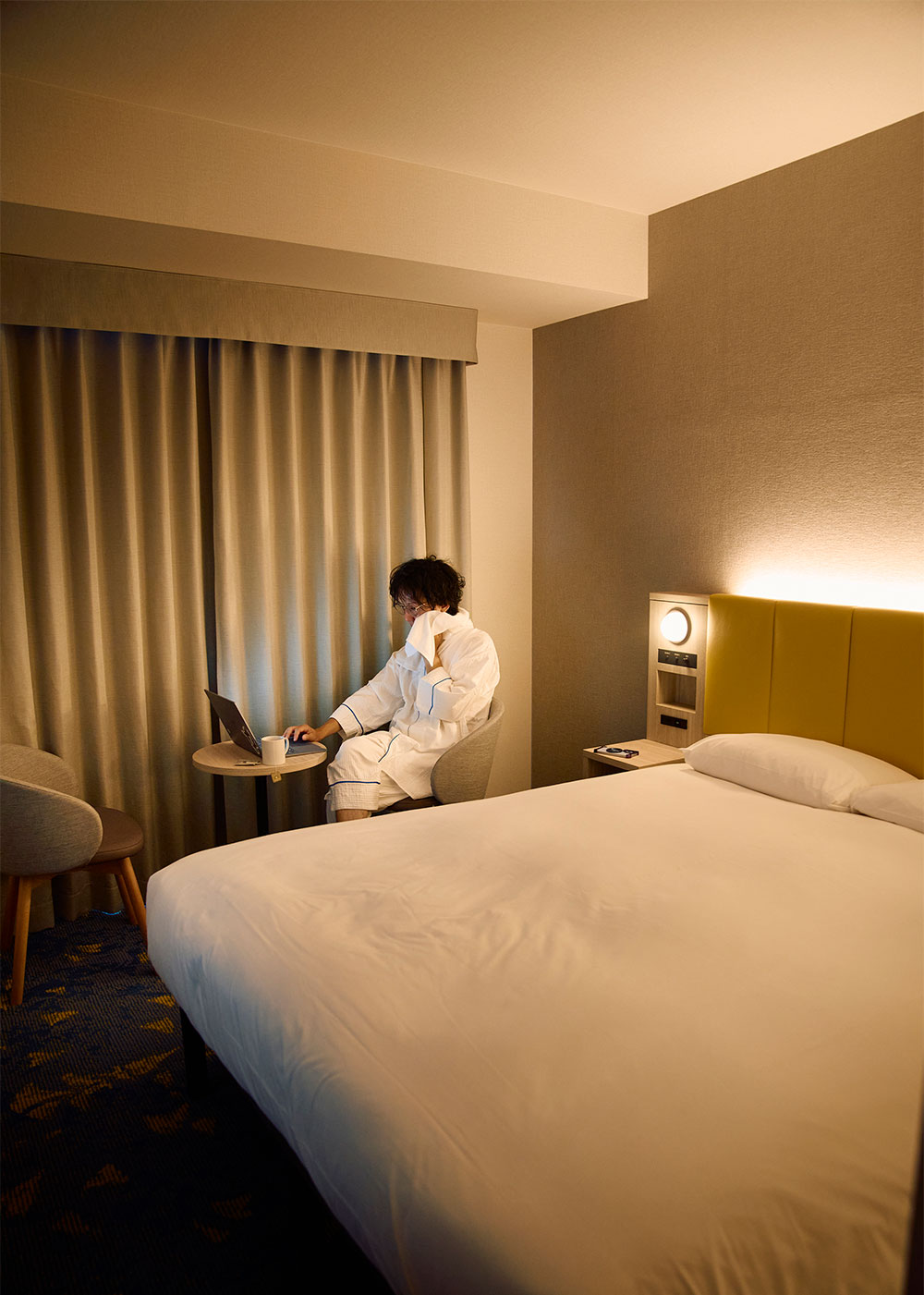 「連泊のお客さま、大歓迎ですよ」とは『JR東日本ホテルメッツ 立川』支配人。2025年2月にリニューアルしたばかりで館内はピカピカ。ロビーでは入浴剤や飲み物などのアメニティが選び放題、コーヒーマシンも使い放題で気分高揚。客室ではイチョウをイメージした黄色い壁にほっこり。シャワーを浴びてランドリーも回したら、ロビーで手に取ったジャスミン茶を淹れて、心安らかに眠りにつこう。