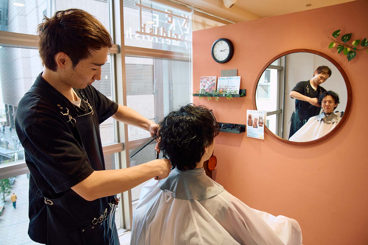 ぐるりとデッキを一周したら美容室『HAREKE meridish』の予約時間に。デッキを見下ろす個室が最高なんだ。「傷んでるとこ、切りますね~」と、店長の梶野慧実さん。「今日も頭皮、揉んでいきますよ~」と、アシスタントの森陽翔さん。この二人に髪と頭皮をメンテナンスしてもらうのが、月に一度の楽しみだ。
