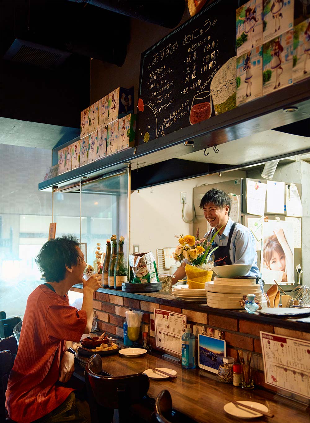 サッパリして気分がいいから、『ワラエバ』で一杯ひっかけよう。「お、髪切りました?」と、店主の井上和久さん。キビキビ仕事をこなしながらも、小さな変化を見逃さない。この細やかさ、彼も天空人と言えよう。