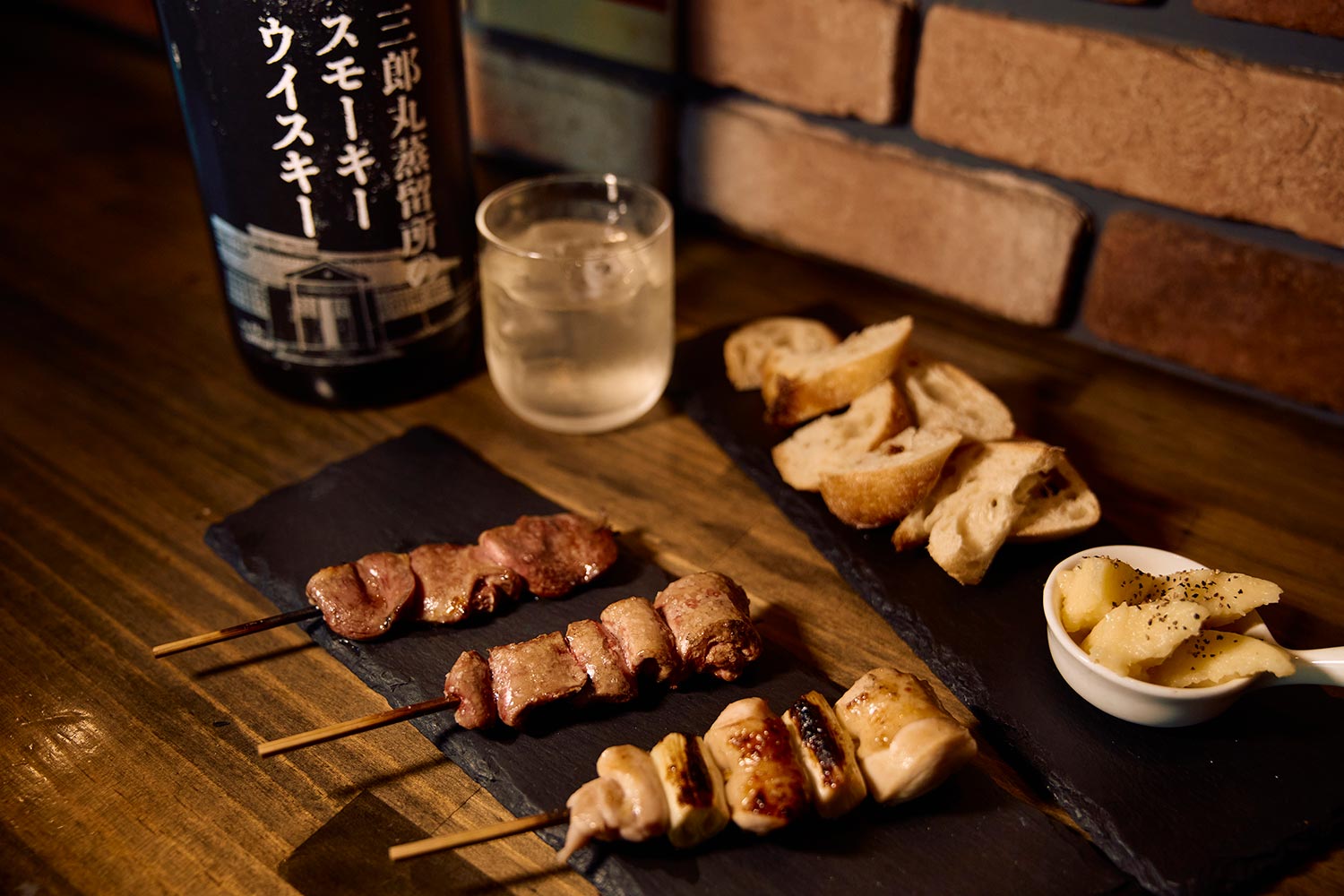 洋食店のごときしゃれた店内に流れる爆音のアニソン。焼き鳥店『ワラエバ』のカオスな風情、妙に落ち着くのが不思議だ。炭火で焼かれた白レバー330円はフワトロ。ウイスキーロック660円との相性たるや、やみつきさ。人気のリンゴバター770円も外せない。深い甘みと軽やかな酸味で、また酒が進む。