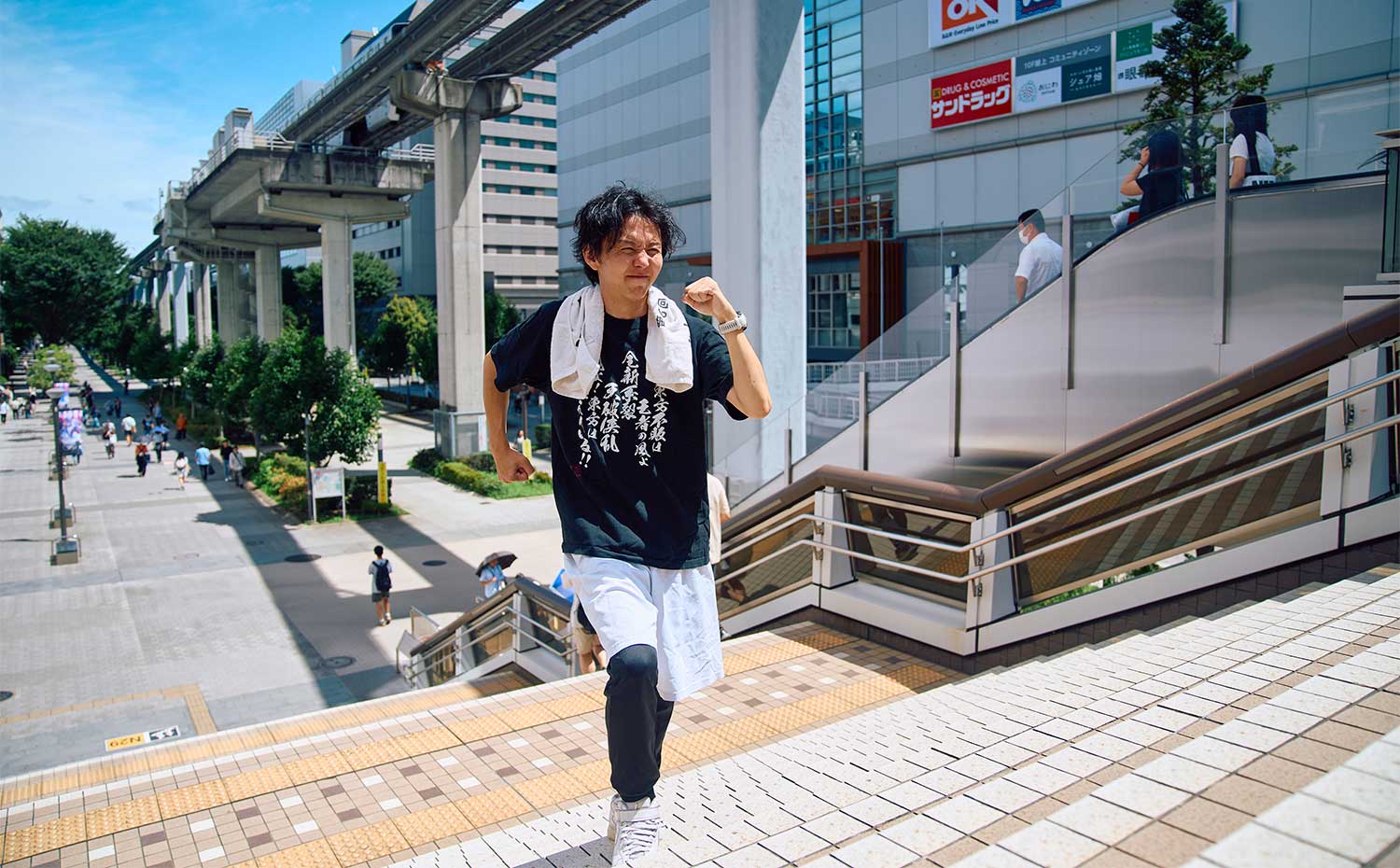 天空人たるもの、体力作りも怠らない。頭上を通り過ぎるモノレールや随所のアートを横目に眺めながら悠々とウォーキング。ぐるりと巡れば汗がにじむ。ふふふ、意識高いな、俺……おっと、うっかり地上に降りてしまわぬよう、気をつけなければ。