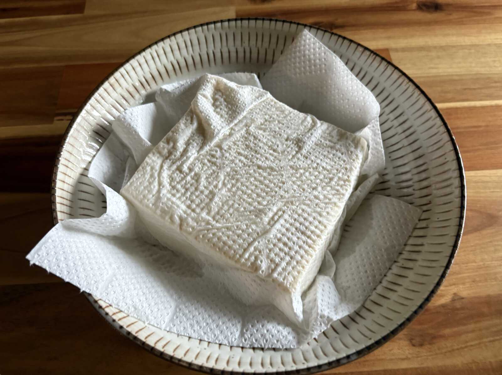 1. 耐熱容器に豆腐を入れ、軽くラップをして600Wの電子レンジで2分(500Wの場合は2分20秒)加熱して、キッチンペーパーをかけて水分を吸い取っておきます。