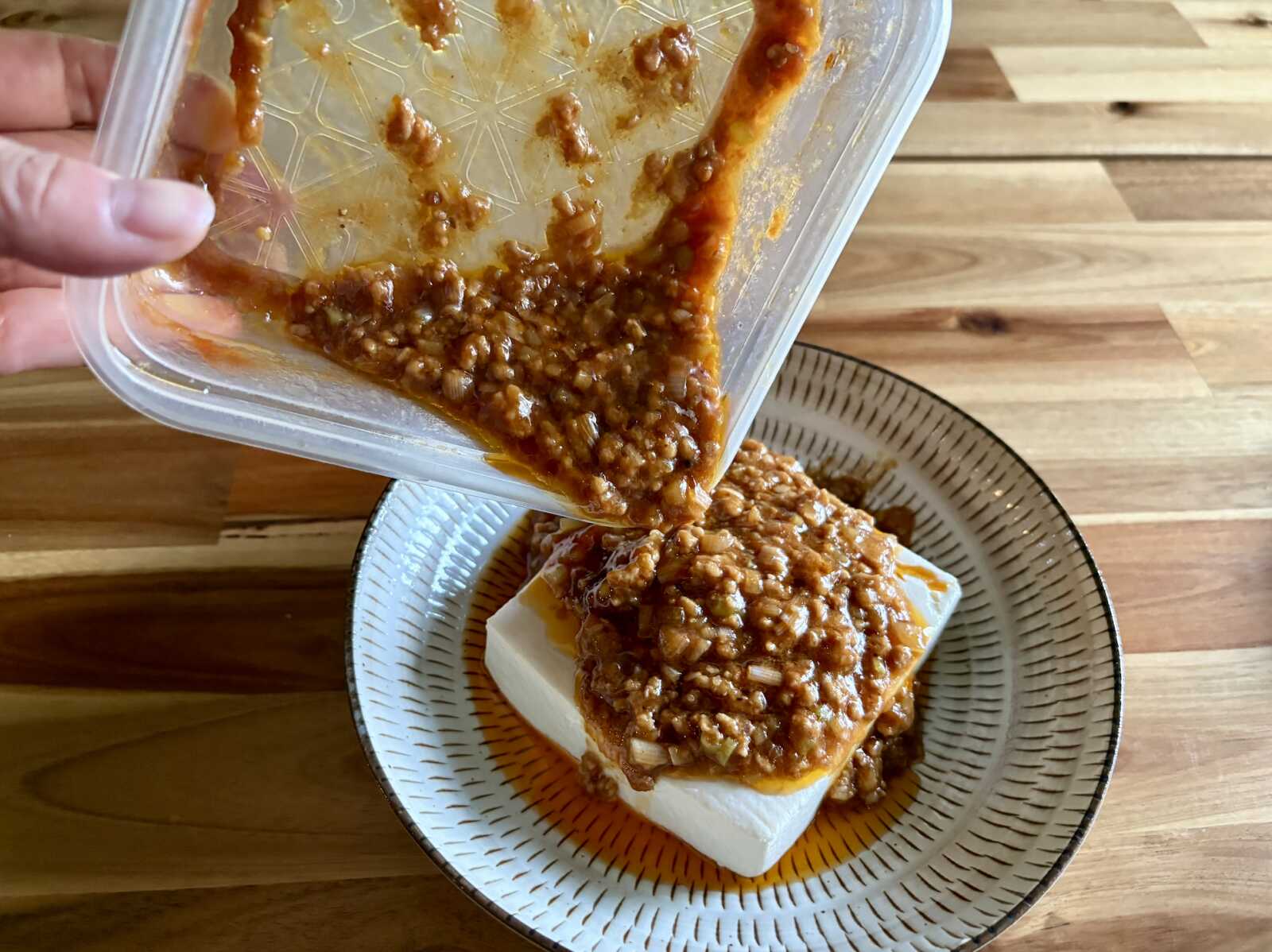 お豆腐にタレをかけた後はスプーンで崩しながらお召し上がりください。大胆にごはんの上にかけていただくのもよいでしょう。きっとごはんが止まらなくなります。