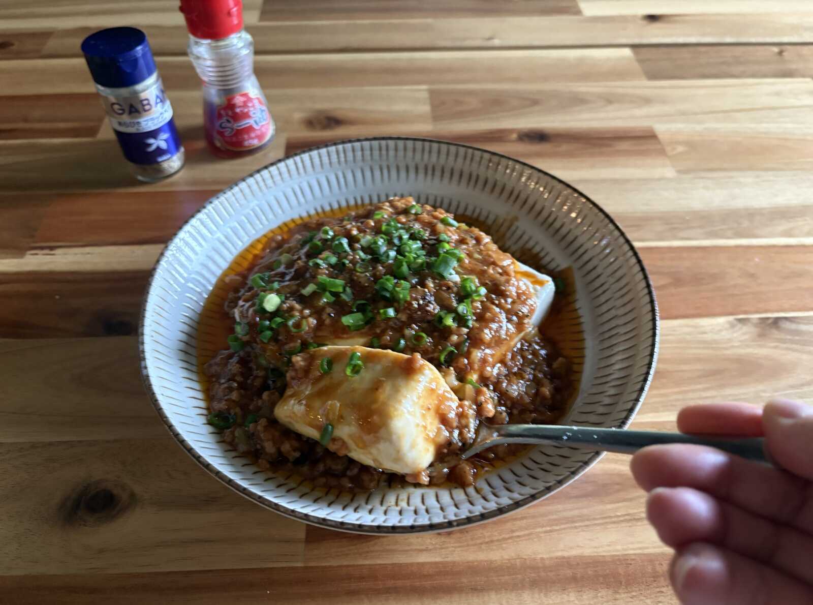 4. 温かい豆腐の上によく混ぜたAをかけて小ネギをちらし、お好みでラー油やブラックペッパーをかけていただきます。