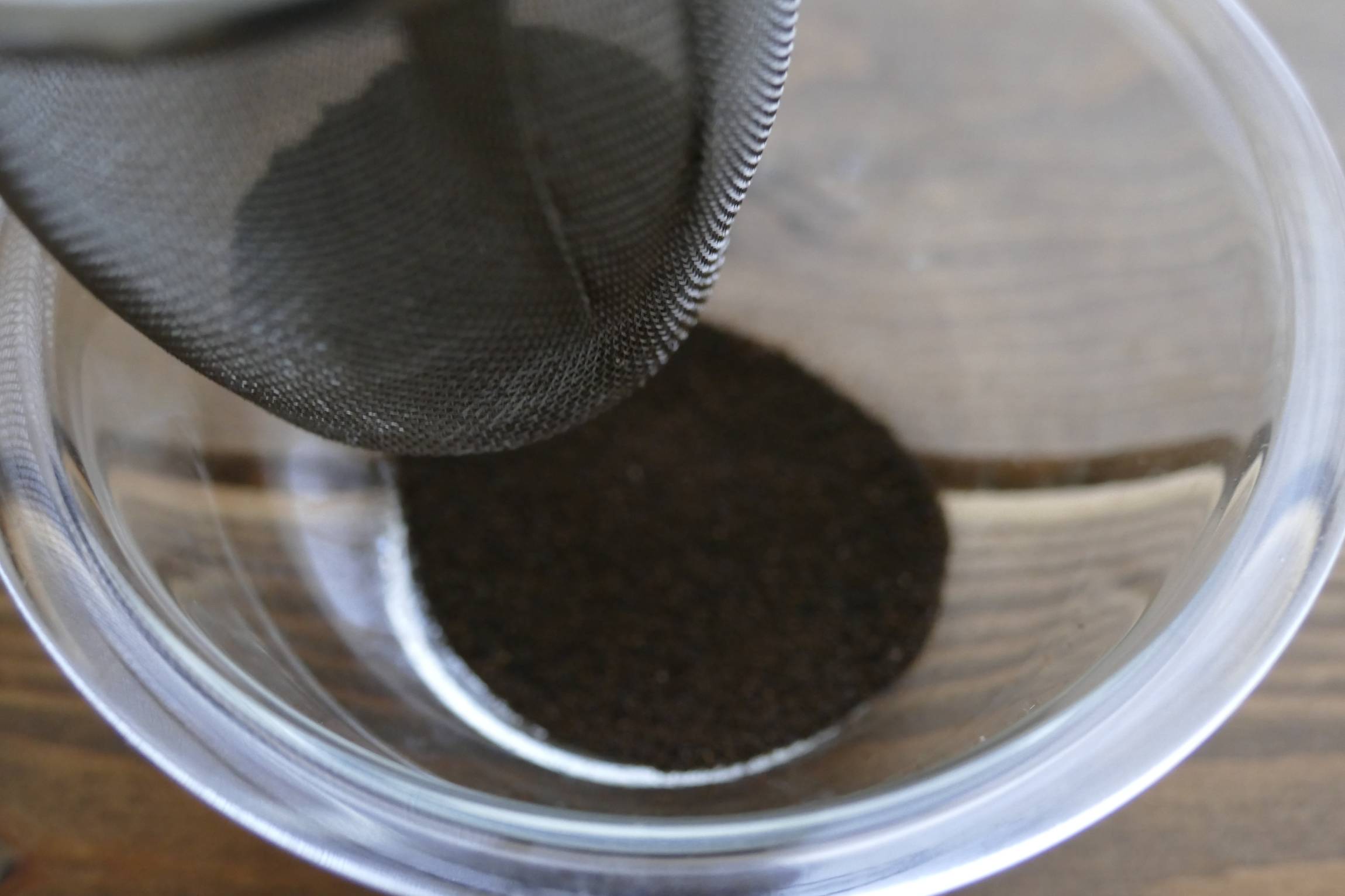 ティーバッグに入っている茶葉を取り出し、茶こしでふるってこします。ティーバッグではない大きな茶葉を使う場合は、ミルで細かく挽くか、すり鉢ですって細かくしてからこします。