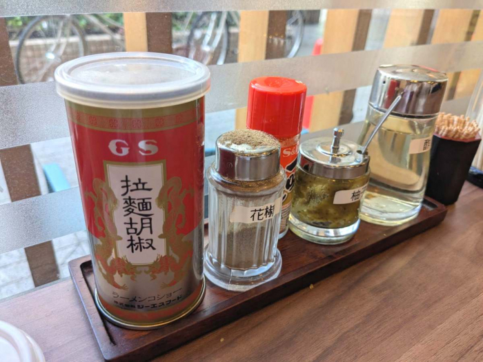 卓上には調味料・薬味として「花椒・柚子胡椒・一味・お酢」が並んでいるので、自分好みにアレンジすることも。途中でお酢をかけてみると、まろやかさがプラスされてより食べやすく感じました。