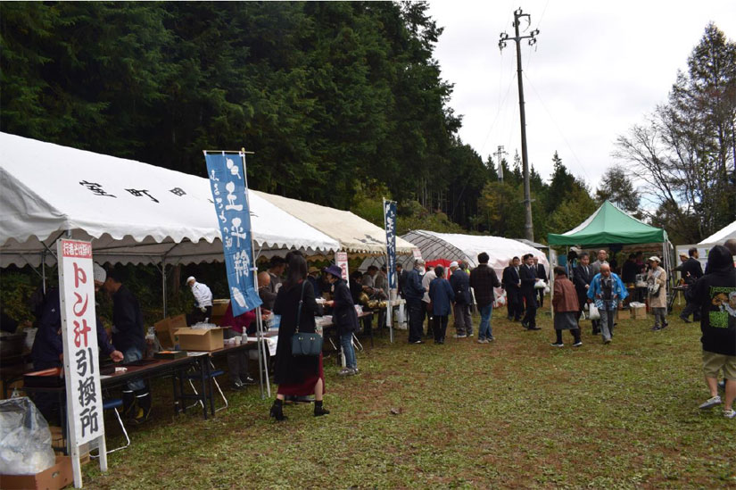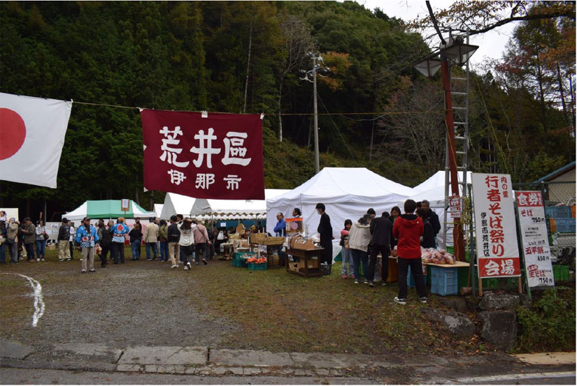 「行者そば」とは、荒井地区に伝わる伝統そばのこと。こだわりの地粉のみを使っており、素朴な味わいが特長で、からつゆで食べるのがこの地域ならではの食べ方。そば以外にも、五平餅や豚汁などを楽しめるほか、地元産の農産物や特産品の販売も予定。荒井地区の秋の味覚を味わって。