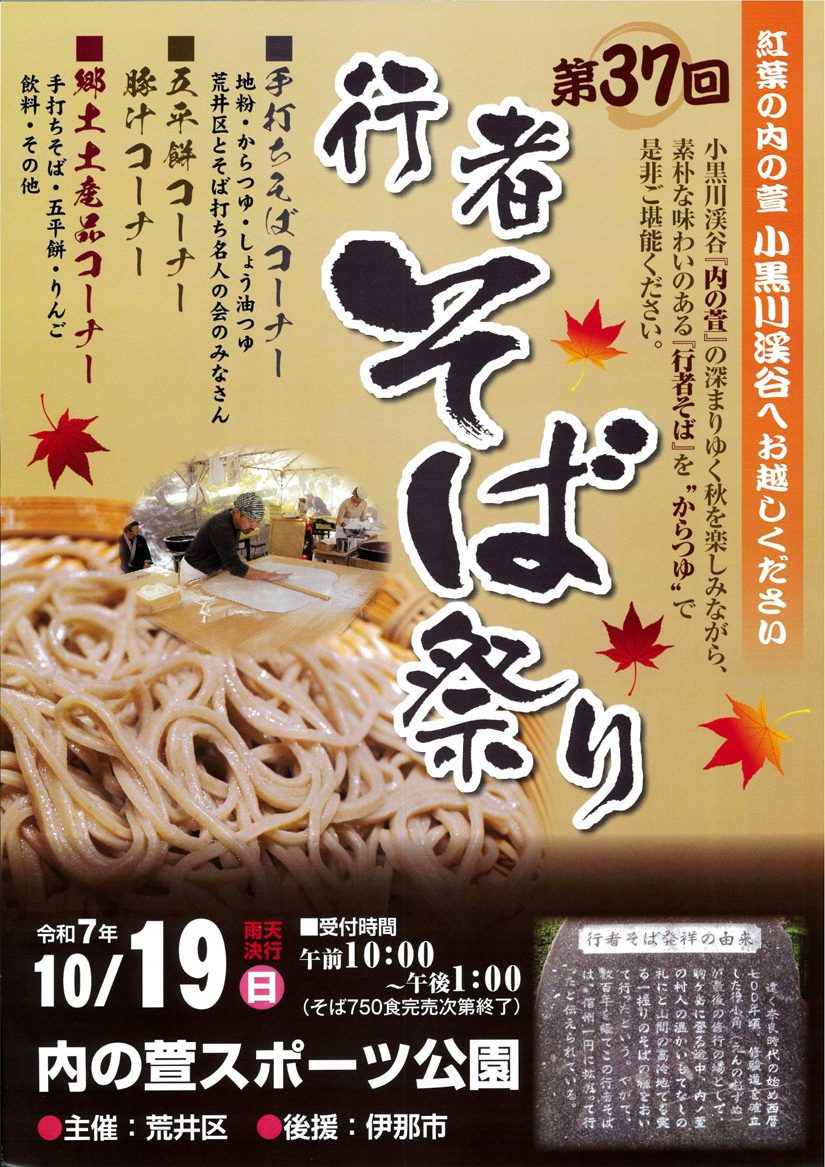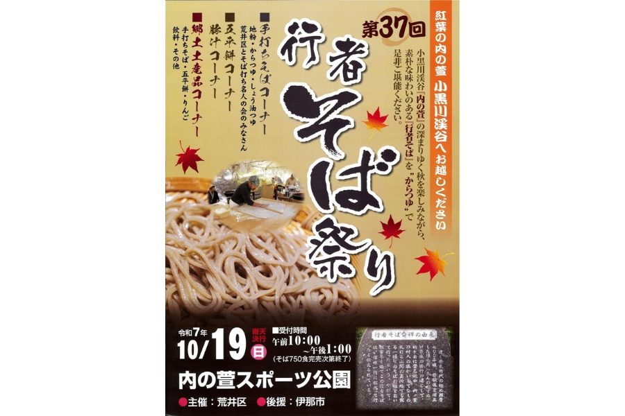 2025年10月19日(日)に、長野県伊那市・小黒川渓谷にある荒井地区の「内の萱スポーツ公園」で『第37回行者そば祭り』が開催。地元のそば打ち名人による手打ちの「行者そば」を、からつゆとしょうゆつゆの2種類で味わうことができます。