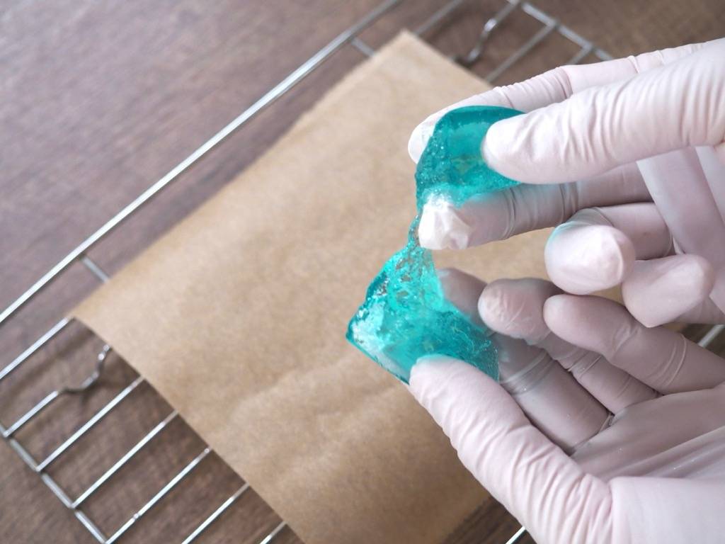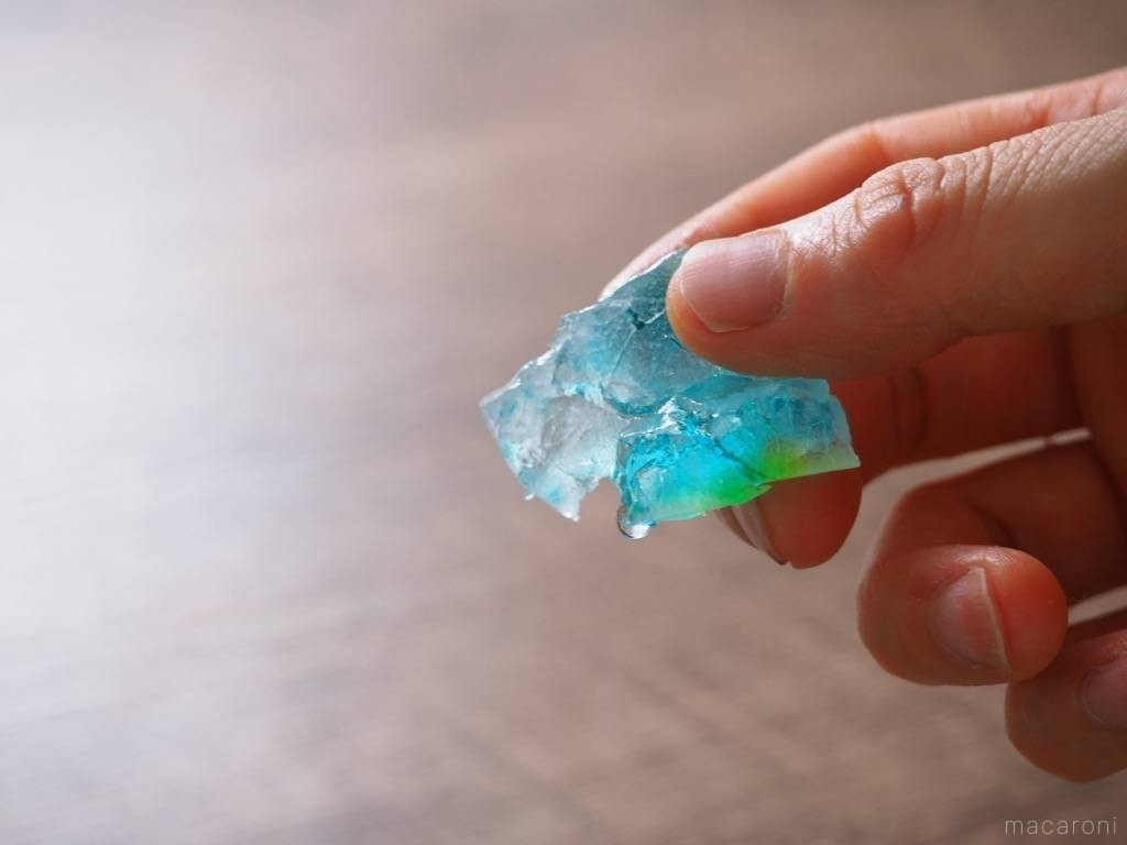 琥珀糖をゼラチンとアガーで作ってみたところ、ゼラチンでは常温で形が保てないけど、アガーでは常温で固まるので乾燥させることができました。次からはレシピを紹介するのでぜひ参考にしてくださいね。