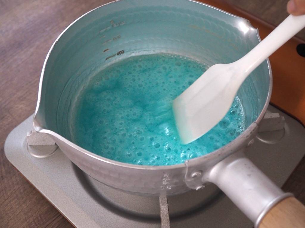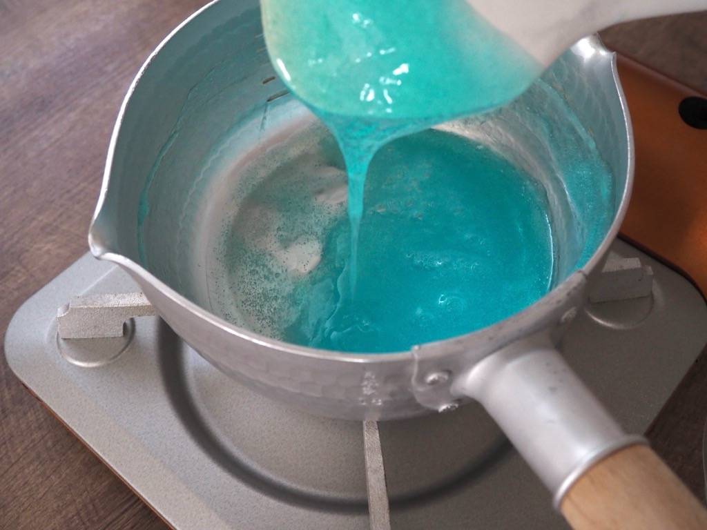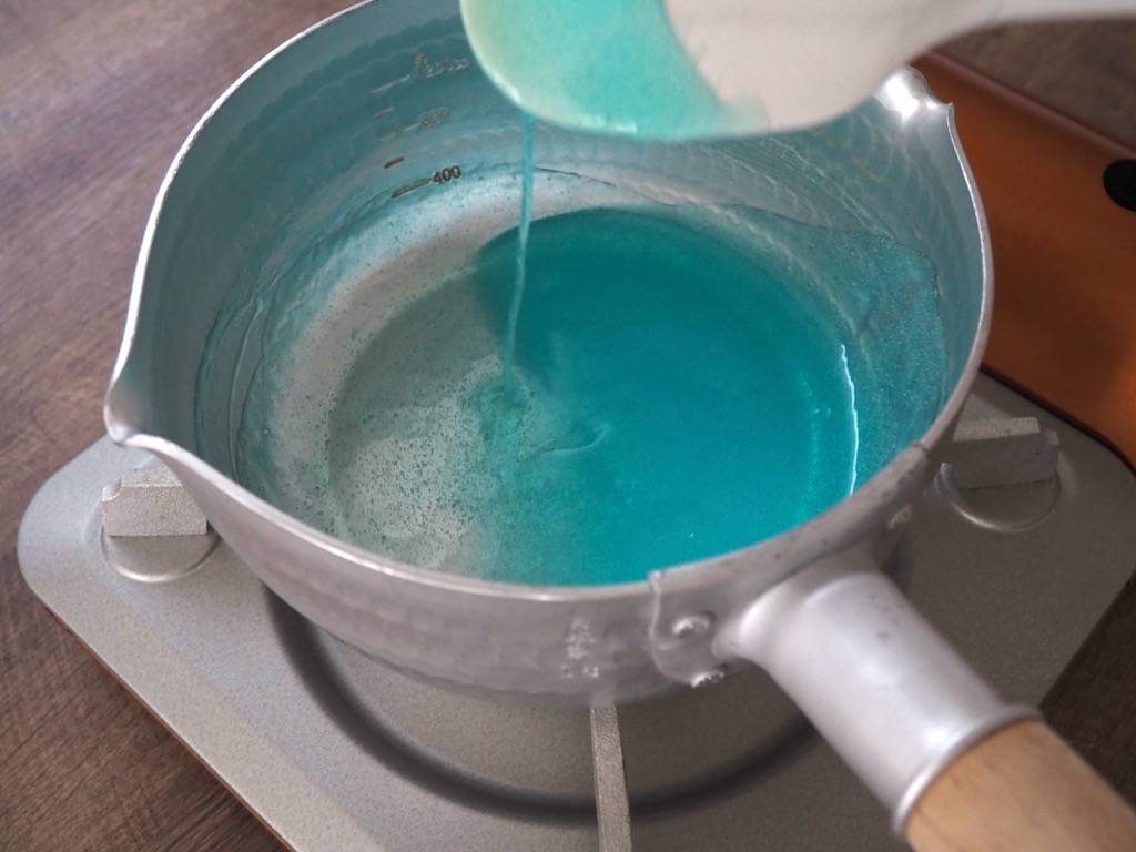 鍋に水と色粉を入れてお好みの色に染めます。