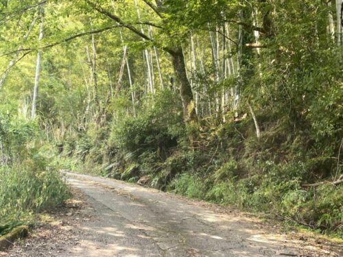 森の中の気持ちの良い道ですが、ところどころアスファルトの舗装が割れていたり、石が落ちていたりするところがあるので、気をつけて運転していかれてください。