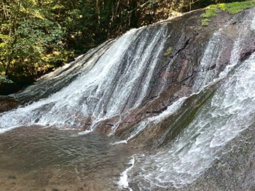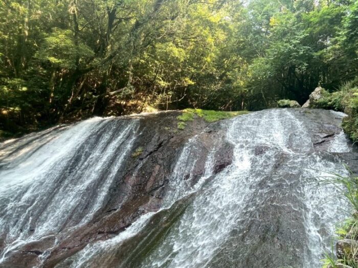 岩肌をすべりおちるように水が流れる渓流瀑で、落差のある滝とはまた違った味わいがあります。
