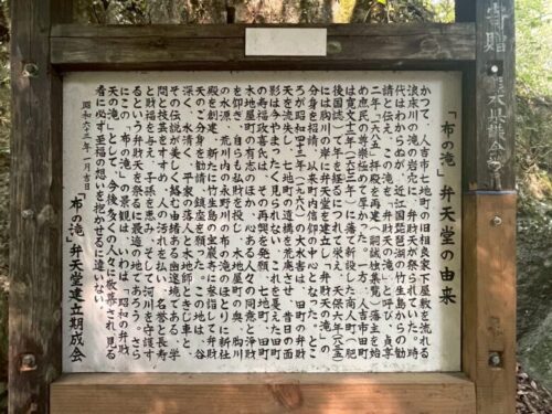 弁天堂の由来の看板によると、江戸時代から胸川の岸にあった弁天堂が、昭和43年の大水害で流されてしまい、町が荒廃…。 再興を願う有志の方々により、ここ布の滝のほとりに、弁財天をまつり創建されたものとのことです。