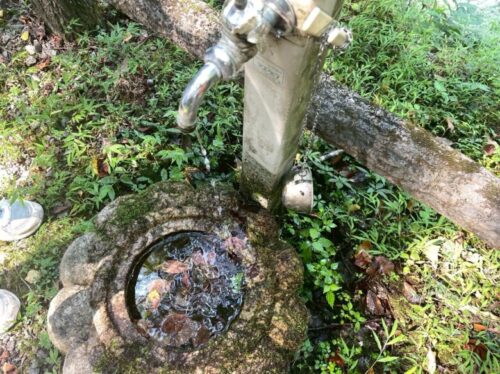 弁天堂から下りる道には、湧き水なのか、コップのぶらさがった水道の蛇口があり、少しずつ水が出ていました。