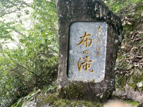 細い山道を進んでいくと、木地屋渓谷「布の滝」の石碑があり、滝に到着します。