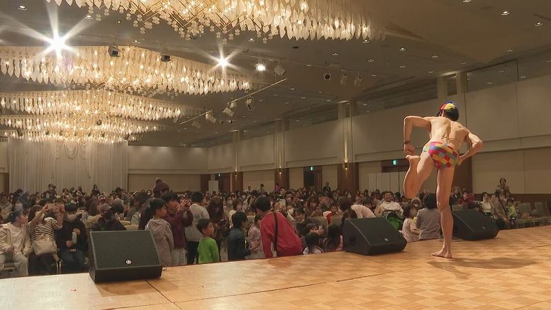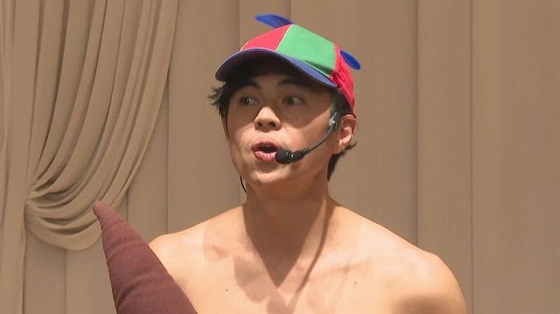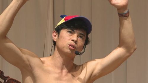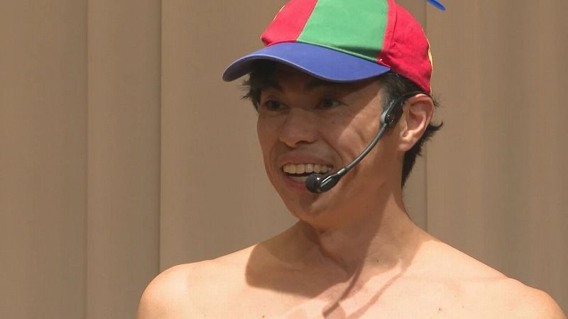 「やっぱり気になるよね。おもしろいかなと思ってやっています。体を鍛えているから、その筋肉を見せた方がおもしろいんじゃないかなと。どうかな?服は着た方がいいかな?」