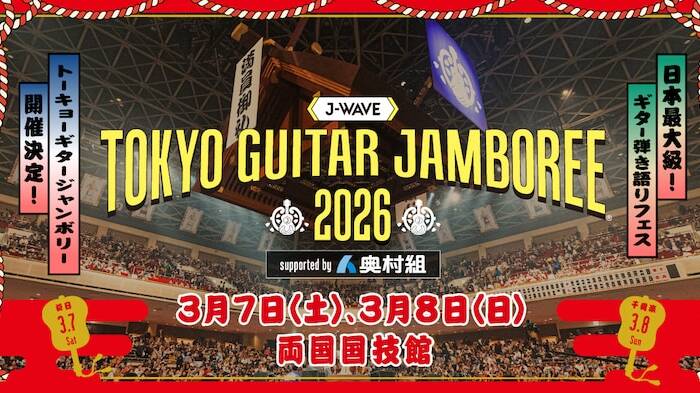 ラジオ局J-WAVE(81.3FM)は、2026年3月7日(土)・8日(日)の2日間、豪華アーティストが共演する、毎春恒例のギター弾き語りの祭典「J-WAVE TOKYO GUITAR JAMBOREE 2026 supported by 奥村組」を、(以下、ギタージャンボリー)を両国国技館で開催する。このたび、第二弾出演者を発表するとともに、チケットのオフィシャル二次先行予約もスタートした。