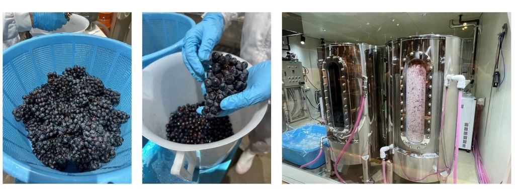 味わいは、レンゲ蜜のようなやわらかな甘味に、奥行きのある酸味とかすかな渋み。香りはカベルネ・ソーヴィニヨンの優雅なアロマと、トロピカルフルーツのような吟醸香が調和し、見た目はぶどう由来の鮮やかなラベンダーピンク色に仕上がっている。