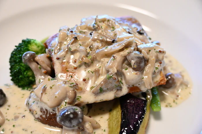 「タスマニア産サーモンのムニエル きのこのクリームソース」(3,000円)*ライスチョイス