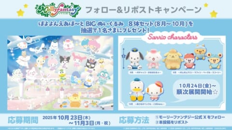 今回のプライズ用景品展開を記念し、モーリーファンタジー公式X(旧Twitter)ではプレゼントキャンペーンが開催されます。「ぽよよんえあぽ~とBIGぬいぐるみ 8体セット(8月~10月)」が抽選で1名に当たります。