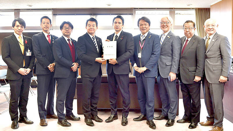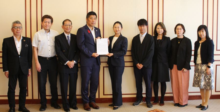 提言書を手にする森智広市長と日下由紀子代表、2団体のみなさん