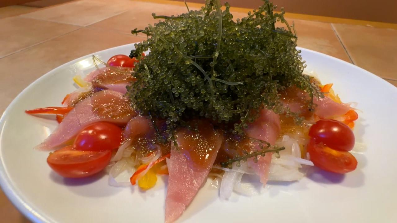 まずは「海ぶどうと刺身のカルパッチョ」。