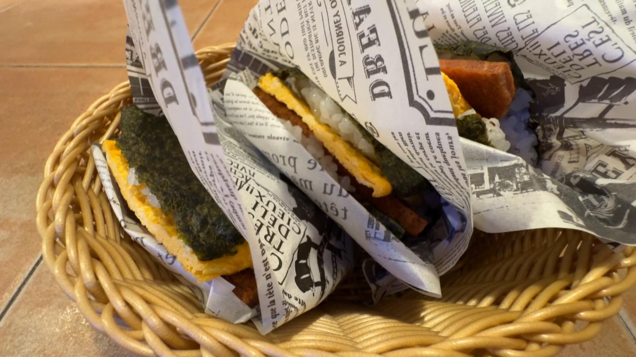 「ちゃんぷる」では、パリッと歯切れのよい海苔にポークと卵焼きを挟んでいます。