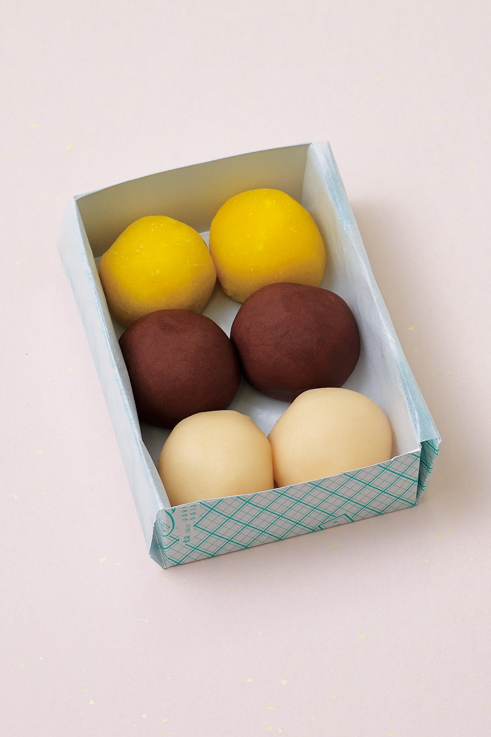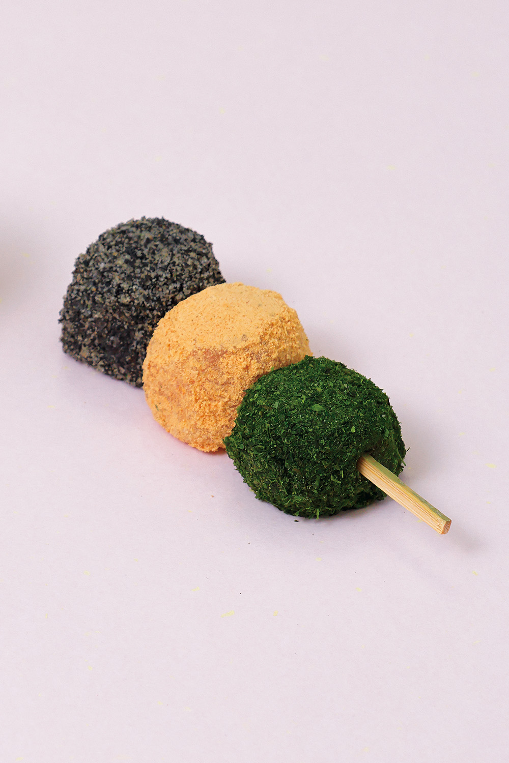 明治30年(1897)、埼玉から出てきた初代が、当時小梅村と呼ばれていたこの地で創業。大福や団子など朝生菓子を並べる「町の和菓子屋さん」だ。串に刺した三色団子は、口に入れるとその正体にびっくり。上下の2つは丸めたこしあんを求肥で包み、それぞれにゴマ、青海苔をまぶしており、真ん中は梅肉入りの白あんを丸めて求肥で包み、きなこをかけている。あんこ好きにはたまらない一品。
