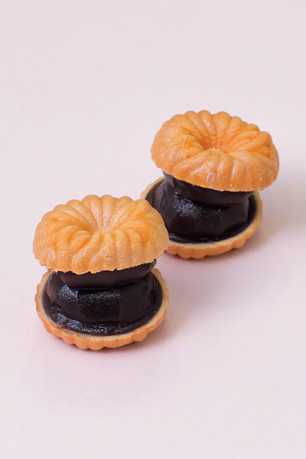 美しい最中は、天皇や皇室を表す十六菊をかたどった特注のデザイン。大納言小豆でこしらえたずっしりしたこしあんに支えられ、天に向かって花を咲かせている。かじるとサクッとした歯触りを楽しめ、品のいい香ばしさがふわり。なお、こしあんは粘度が高く、それでいて繊細さも兼ね備えているので、その食感を保ちながらきれいな腰のくびれを形作るためには、熟練の職人技が必要なのだとか。