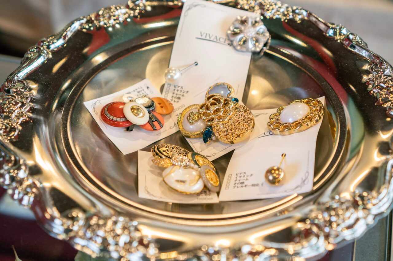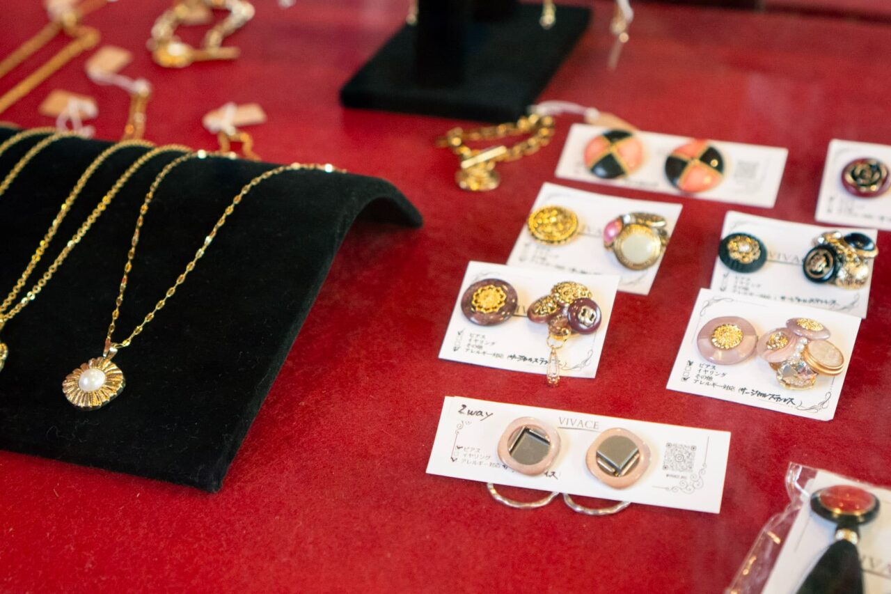 かよさんはアクセサリー作家としても活動しており、自身のブランド「VIVACE」のアイテムも店内で販売しています。長い時を経て世界各地を巡ってきた個性豊かなヴィンテージボタンを使ったアクセサリーは、ほとんどが一点もの。可愛さの中にもエッジを感じさせる、遊び心があるデザインが魅力です。