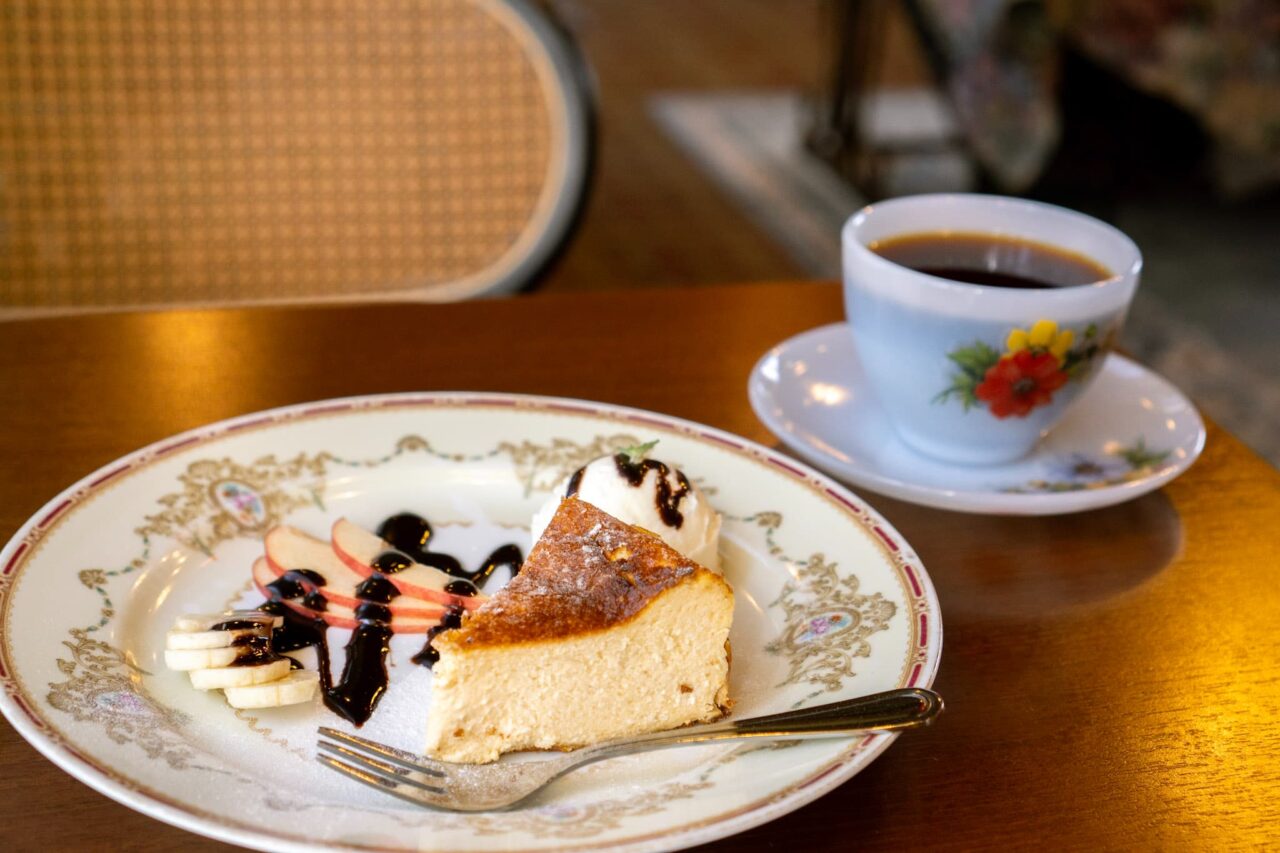米粉を使った自家製バスクチーズケーキは、口に入れるととろけるようなしっとり食感が楽しめます。チーズ本来の濃厚な風味をしっかり感じられながらも、軽やかな口当たりで甘さが控えめの大人の味わい。