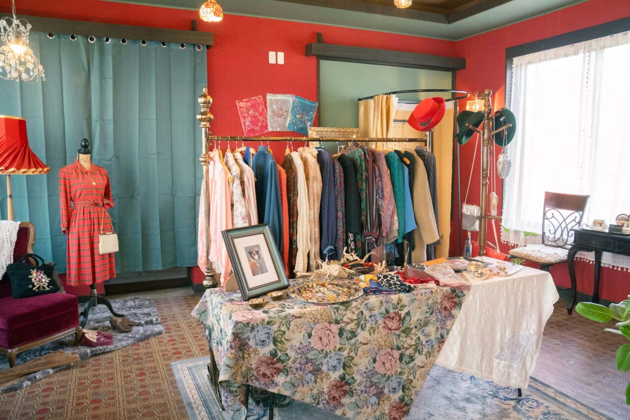 お店の奥のスペースでは、オーナーの目利きで各地から仕入れたアンティーク雑貨や古着、ファッション小物などが販売されています。