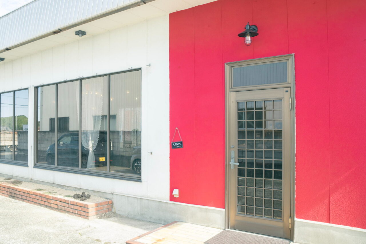 七山交差点の道が交わる場所に、ひときわ目を引くヴィヴィッドな赤色の建物があり、そこにお店を構えています。