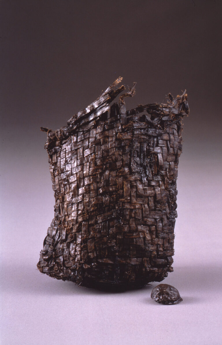 ヒノキの樹皮を薄いひも状にして袋形に編んだカゴです。現代の竹細工にも使われる網代あみで編まれ、カゴの中には半分になったクルミの殻が入っていました。