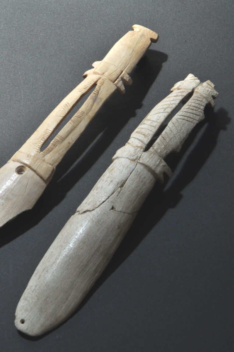 貝塚から出土したシカの角でできた祭祀用のスプーンには、独特の突起やスリットなどの装飾がありました。その造形は近隣の続縄文時代(本州の弥生時代)の遺跡でも見られ、4000年もの間変わらずに作られていたことが分かりました。