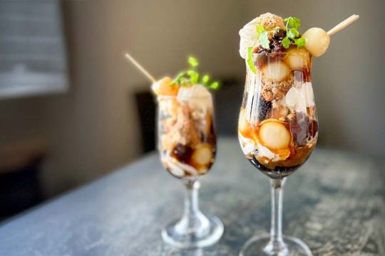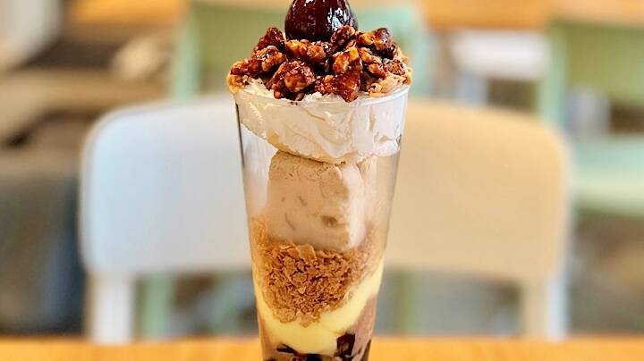 10月はお月見をイメージした『みたらしきなこパフェ』が登場。高さ約20cmのグラスには、きなこ風味のシフォンケーキや粒もち入りの黒蜜きなこアイスなどがぎっしり詰まっています。さらに、甘じょっぱいみたらしのタレがアクセントに。異なる食感や味わいが何層にも重なり、トップにはもちもちの串ダンゴが彩りを添える、和テイストの季節限定パフェです。