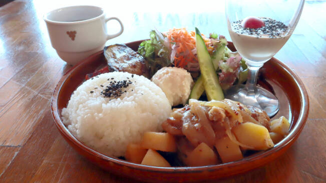料理の内容は日によって変わり、取材日のメインはホロホロになるまで煮込んだ「鶏の甘辛煮」と根菜のかき揚げがのった「揚げだし餅」。白菜やニンジン、ゴボウなど、地元で採れた旬野菜がふんだんに使われていて、その時々で旬を堪能できるのも魅力です。