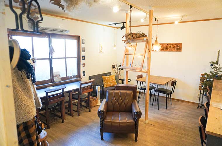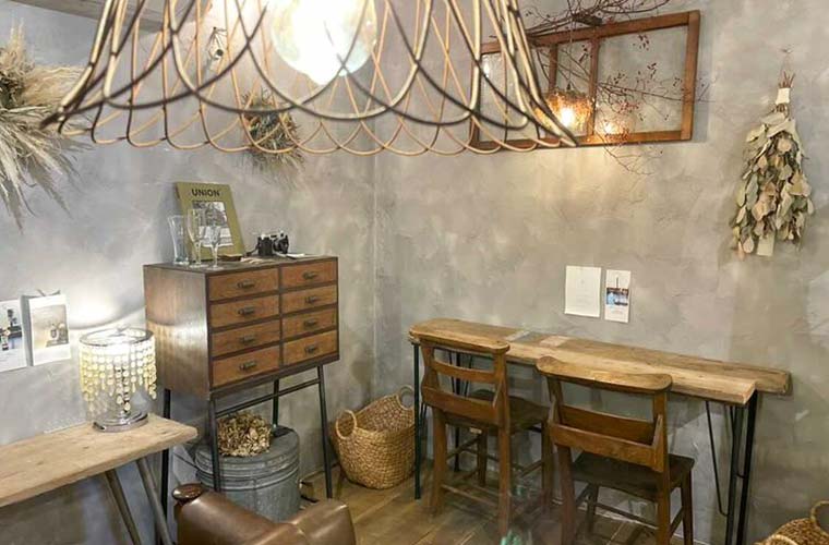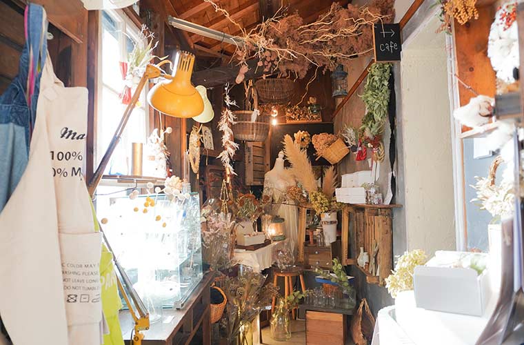 店内はナチュラルな家具やアンティークテイストの雑貨、ドライフラワーで飾られた大人かわいい空間が広がります。漆喰を塗るなど、スタッフが一丸となってDIYをしたこだわりのインテリアは、どこを切り取ってもインスタ映え!居るだけで乙女心が高鳴り、ときめきが止まりません。