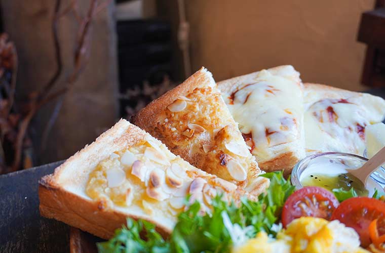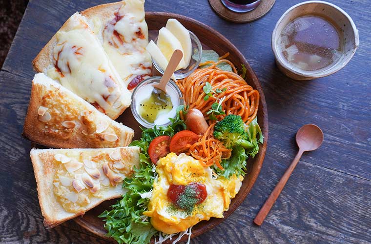 のんびりしたい週末の朝には、ボリューム満点のパンセットがおすすめ。主役のトーストは、『アーモンド』や『チーズ』、『おぐら』など7種類から好きなものを2種類選べます。プレートにはそのほか、チーズ入りのスクランブルエッグや野菜の副菜、ナポリタン、フルーツ、自家製ヨーグルトなどが盛られていてボリューム満点!スープとセットドリンクも付いてコスパ◎です。
