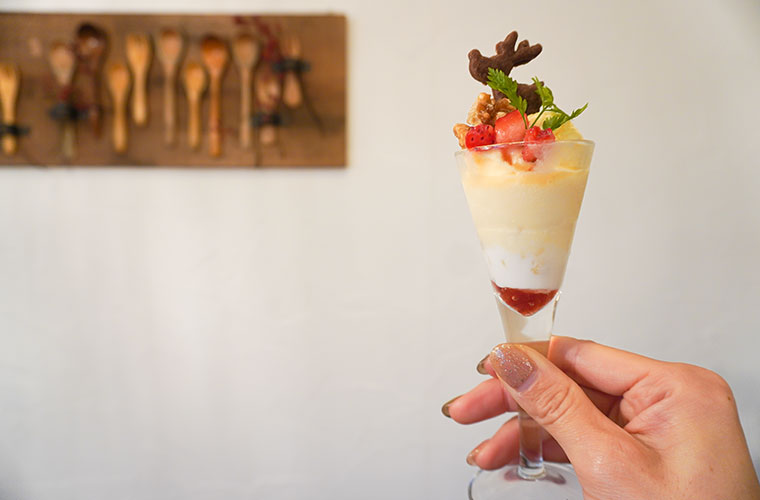 カクテルグラスに入ったセットのパフェは、見た目もサイズもかわいらしいのがポイント。セットのパフェは、カフェタイムに人気の『月替わりパフェ』と合わせているので、毎月違ったものが登場します。取材日は、トナカイクッキーがちょこんとのったクリスマス仕様のパフェ。自家製ヨーグルトとシルクソフトのミルキーな味わいが食後にぴったりです。