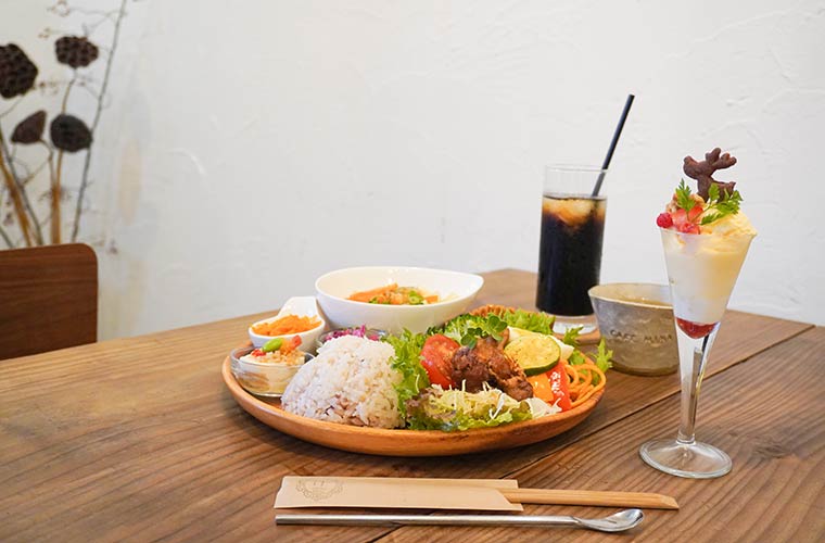 10種類以上の野菜を使い、カラフルで目でも楽しめるワンプレートランチは、平日だけのお楽しみメニュー。プレートの上には、ボリュームのあるメインが2種と野菜の惣菜が5種、「ミルキークイーン」の十六穀米が色鮮やかに盛られています。さらに、野菜スープとセットドリンク、デザートのカクテルパフェが付いてこの値段はお得感がいっぱい!