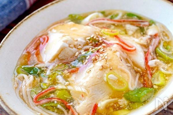 温めてぷるんとした豆腐に、ねぎとかにかまが入ったあんかけをたっぷり絡めた一品。彩りも良く、あと一品足りないときの副菜にぴったりです。豆腐は食感のやわらかい絹ごし豆腐で作るのがおすすめ!