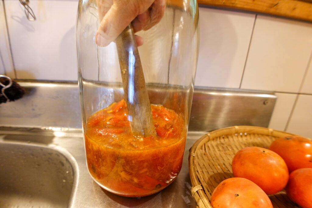 ② 柿を瓶に入れて潰す(硬い柿は潰してから瓶へ)