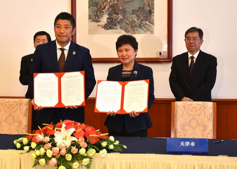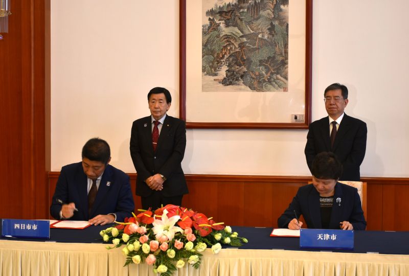 次代を担う青少年の相互理解と友好を深め、経済貿易、文化、スポーツ、教育、観光、医療、健康福祉などの分野での交流と協力を推進し、民間友好交流の礎を築くことなどを内容とする友好都市提携45周年記念宣言書を、天津市の張玲副市長と四日市市の森智広市長が署名して交わした。