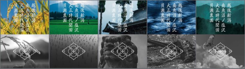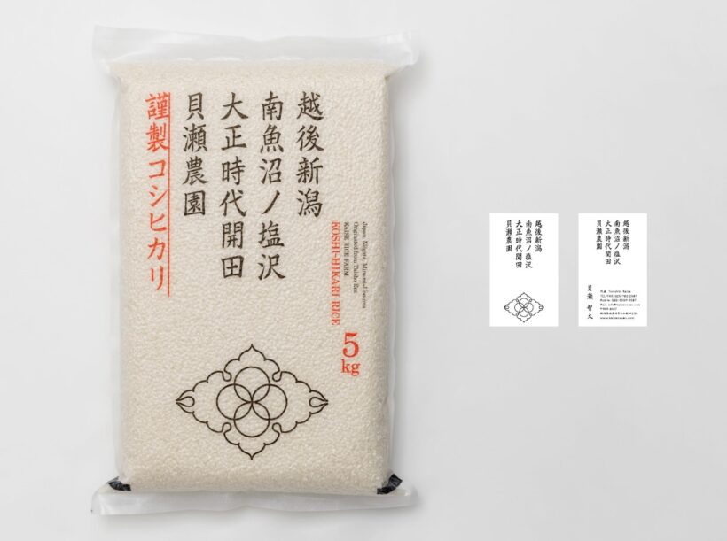 受賞作品「越後新潟南魚沼ノ塩沢大正時代開田貝瀬農園」の米袋と名刺のデザイン(提供:新潟アートディレクターズクラブ)